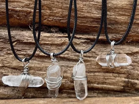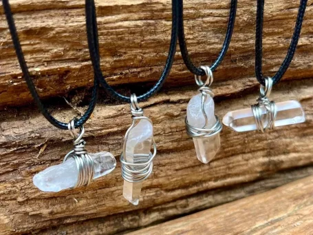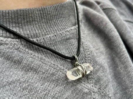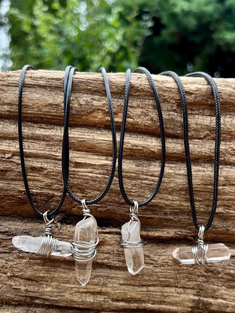 Diese Kette verbindet Natürlichkeit mit einem Hauch rauer Eleganz. Ein klarer Bergkristall von mir von Hand mit Draht umwickelt, hängt an einem schlichten Kunstlederband. Der Bergkristall gilt als Stein der Klarheit und des Schutzes.